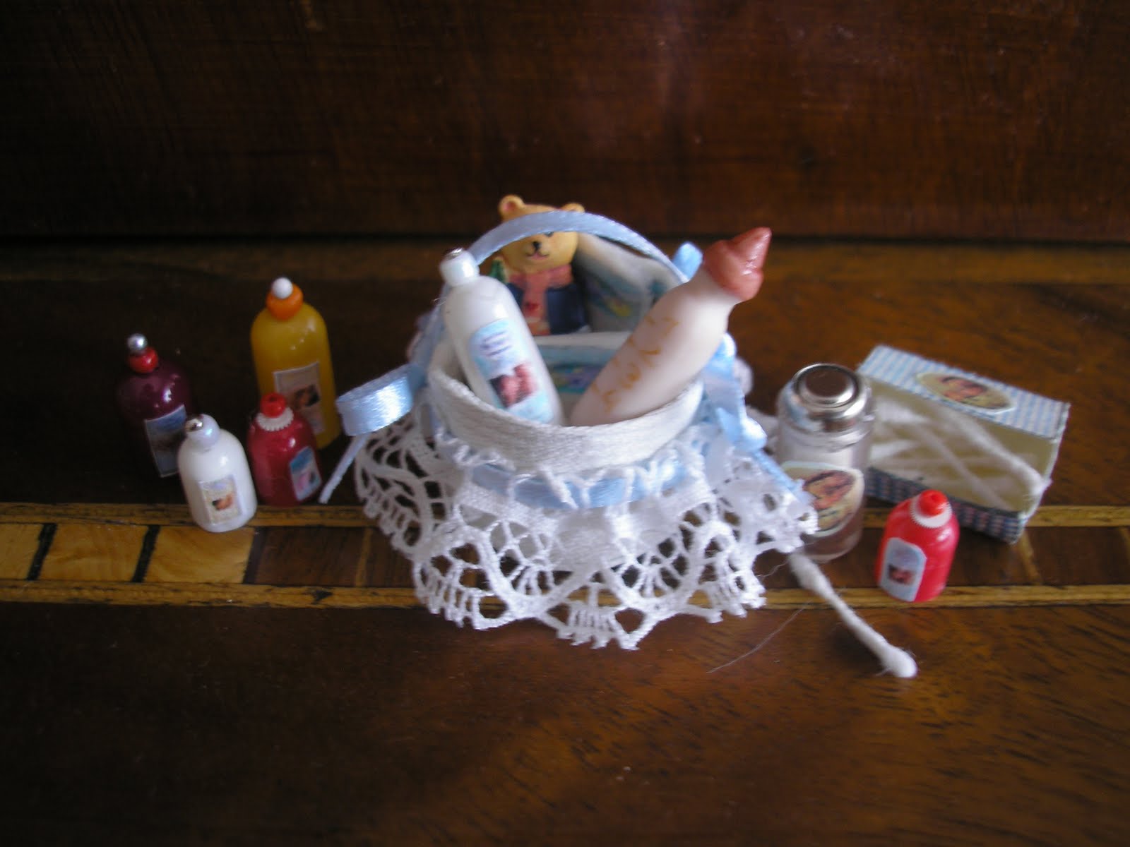 , también he realizado esta cestita de productos para bebés, colonia, bastoncillos, pañales son regalo de Marian, y el biberón hecho de porcelana.