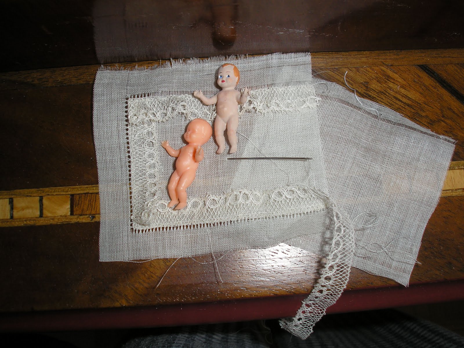 La puntilla esta hecha de bolillos y cosida con vainica simple.