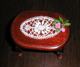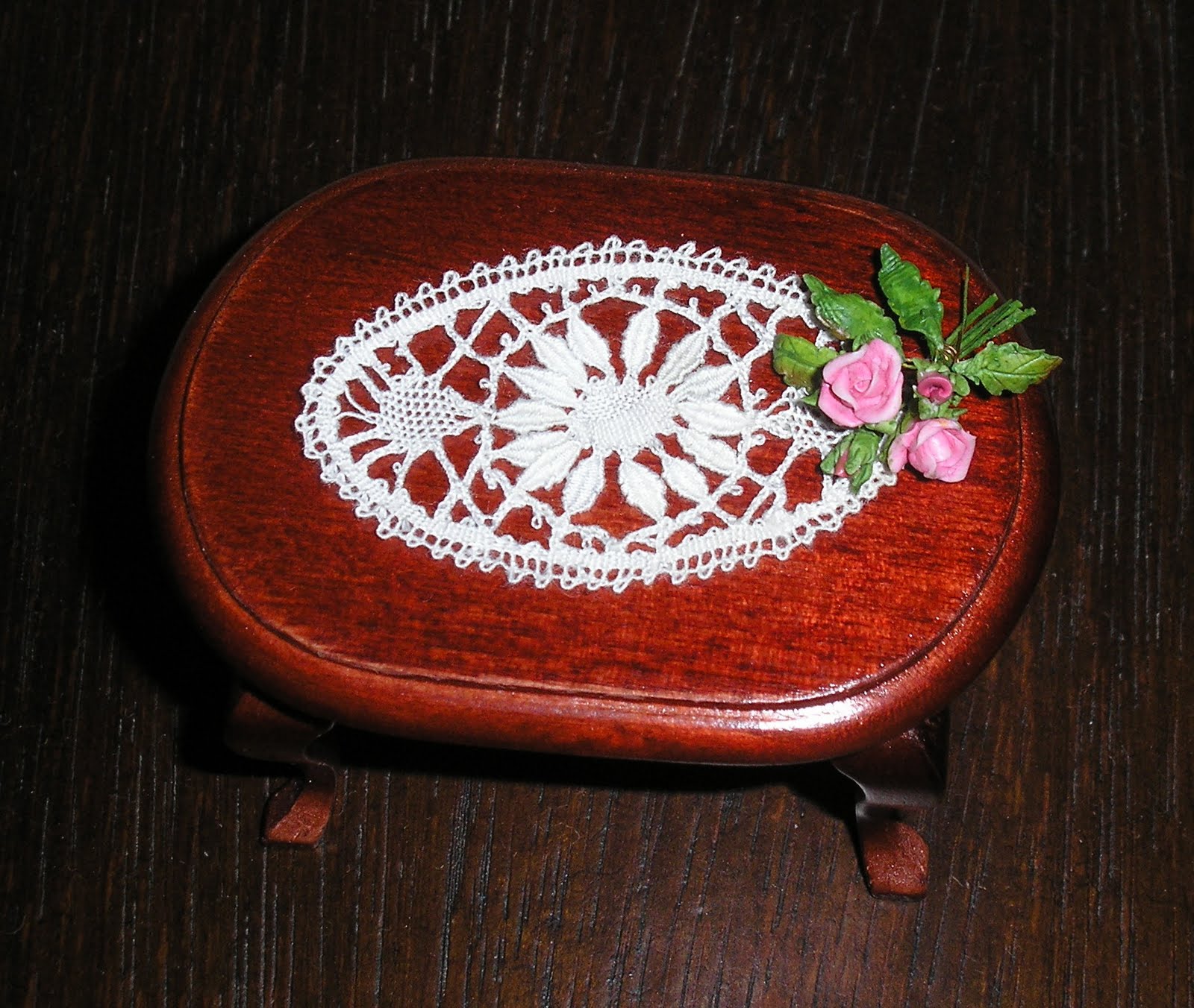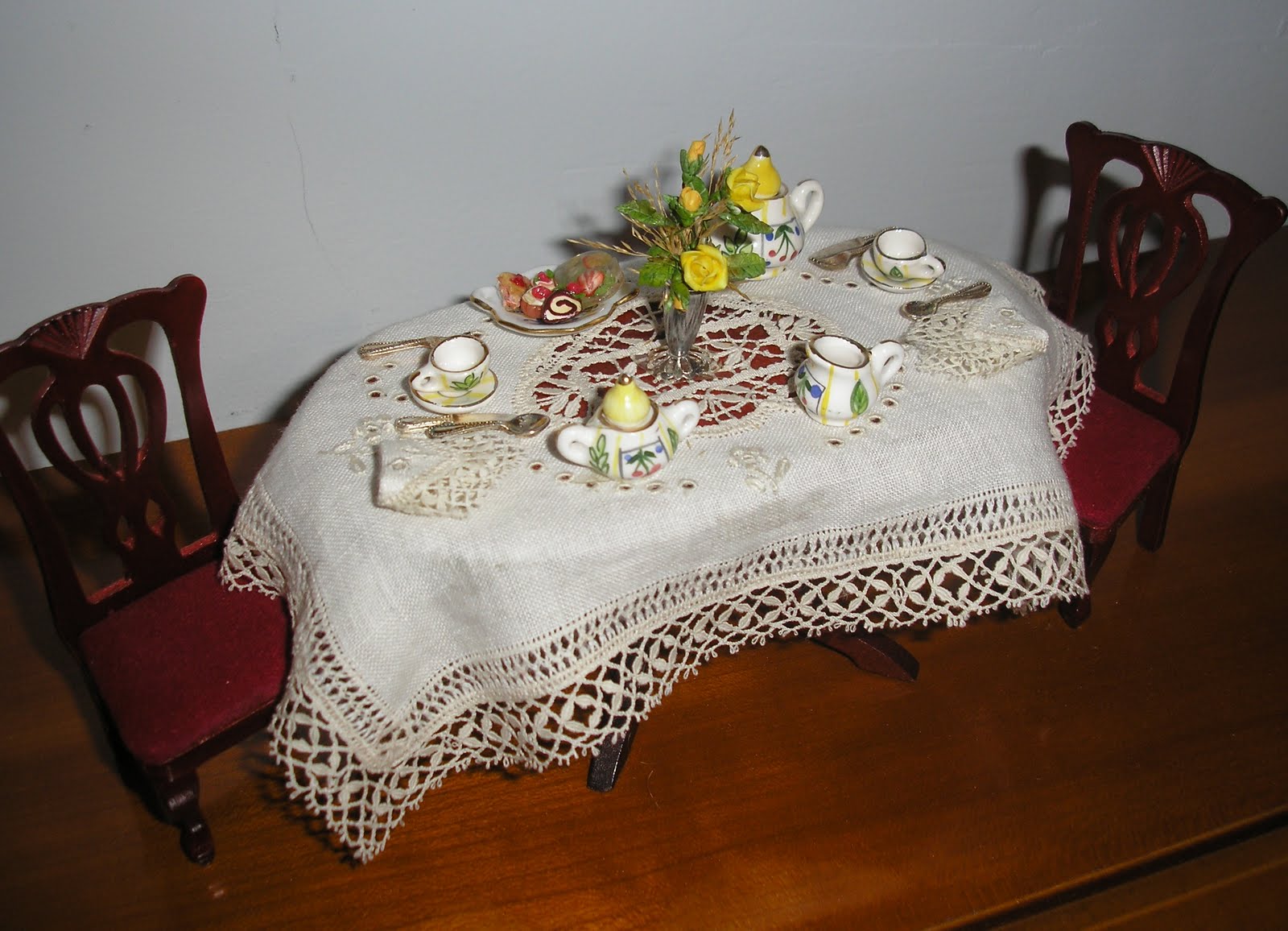 Una de las piezas de bolillos que más me gusta como me ha quedado ha sido el mantel de bolillos, está adornado con flores de porcelana rusa y unos pastelitos realizados por Marga Vives